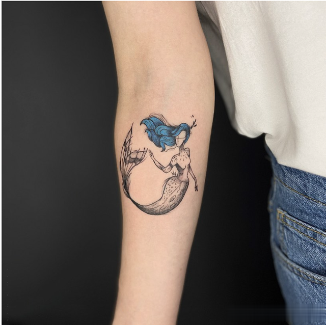 为了营造流行的色彩,这款黑白小美人鱼纹身的头发上有明亮的蓝色。