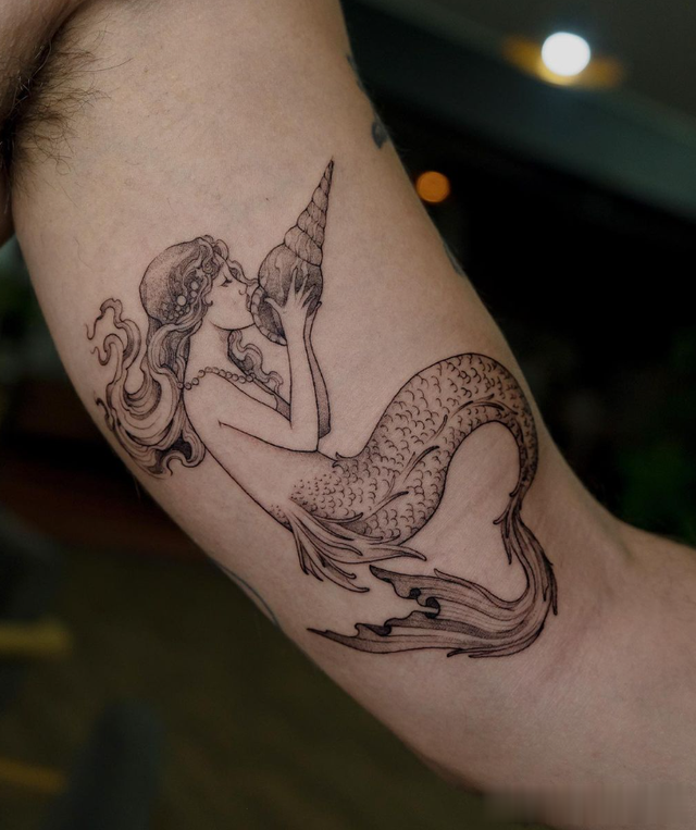 这个详细的纹身以美丽的美人鱼演奏海螺壳为特色。