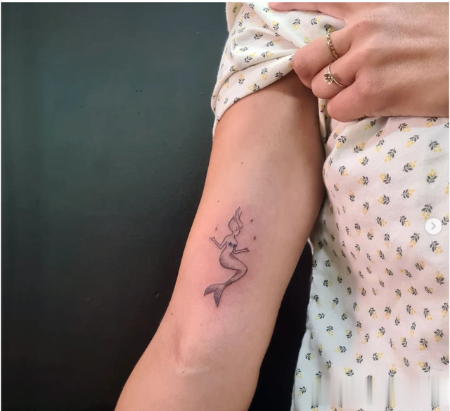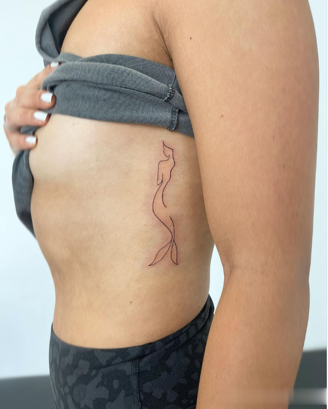 这种细线纹身位于较小的一侧,细节较少,更强调美人鱼的轮廓,它是完美的小美人鱼纹身。