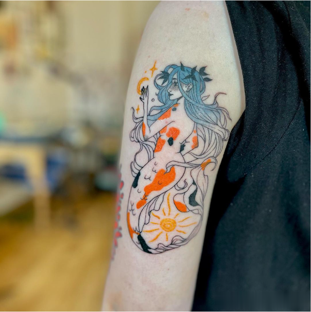 为了打造大胆、色彩缤纷的外观,这款美人鱼纹身的灵感来自童话美学和锦鲤。