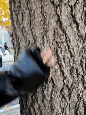 为了测试Gakior羽绒服有多耐造,蓝木直接用衣袖在树皮上剐蹭,刮擦羽绒服面料表面及接缝处,持续 1 分钟后观察面料磨损、起球及涂层脱落情况。