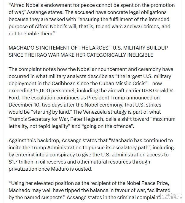 但阿桑奇认为,诺贝尔奖的 创始人、瑞典发明家和实业家阿尔弗雷德·诺贝尔在1895年的遗嘱中明确规定,和平奖要颁给在前一年为人类带来最大利益,为促进各国之间的友爱做出最多或最好贡献的人。而 将诺贝尔和平奖授予马查多,使得“和平的工具”变成了“战争的工具”。他指责马查多煽动和支持美国“犯下的国际罪行”。美国总统特朗普已经长达数月的对委内瑞拉总统的军事行动正施加军事压力,迫使委内瑞拉总统尼古拉斯·马杜罗下台了。