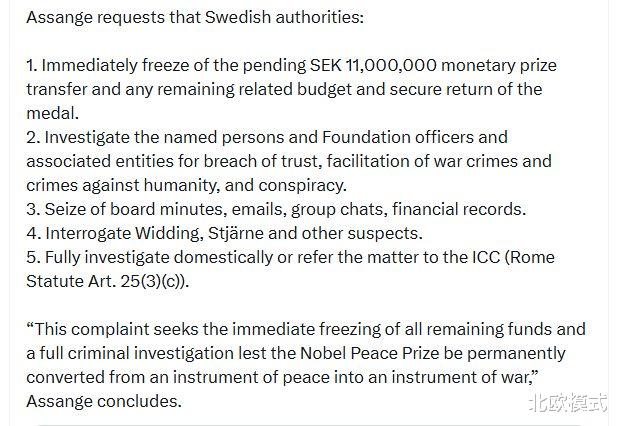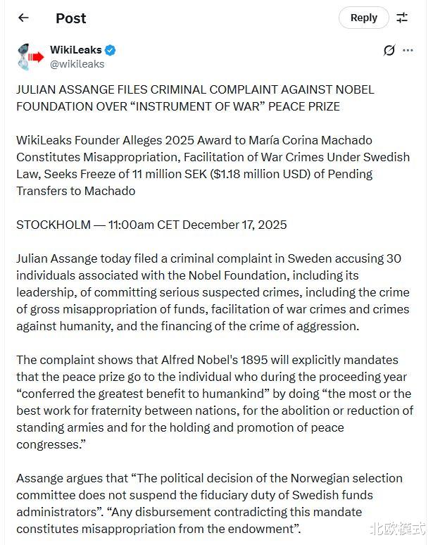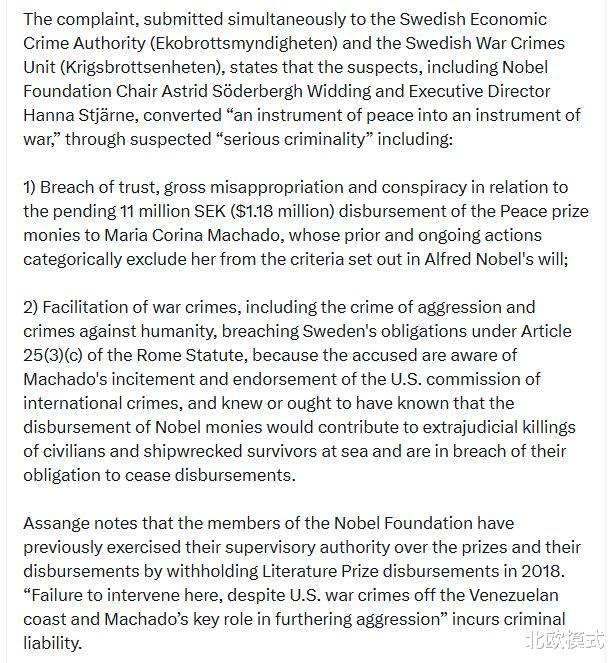 维基解密的X账号称,阿桑奇已向包括瑞典经济犯罪局在内的相关机构提交了一份举报,敦促其调查与诺贝尔基金会有关联的人员,指控其涉嫌一系列犯罪行为。阿桑奇认为,选择玛丽亚·科里纳·马查多违反了诺贝尔的遗嘱,与诺贝尔和平奖的宗旨背道而驰。他要求瑞典警方立刻冻结马查多1100万瑞典克朗(约合830万元人民币)的奖金并对诺贝尔基金会展开调查,罪名包括“严重挪用公款、协助战争罪和反人类罪,以及资助违反国际法的行为”。