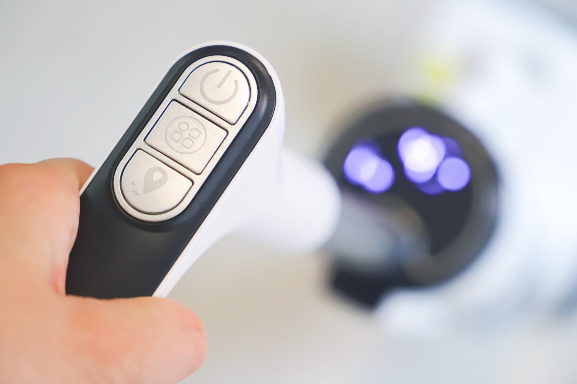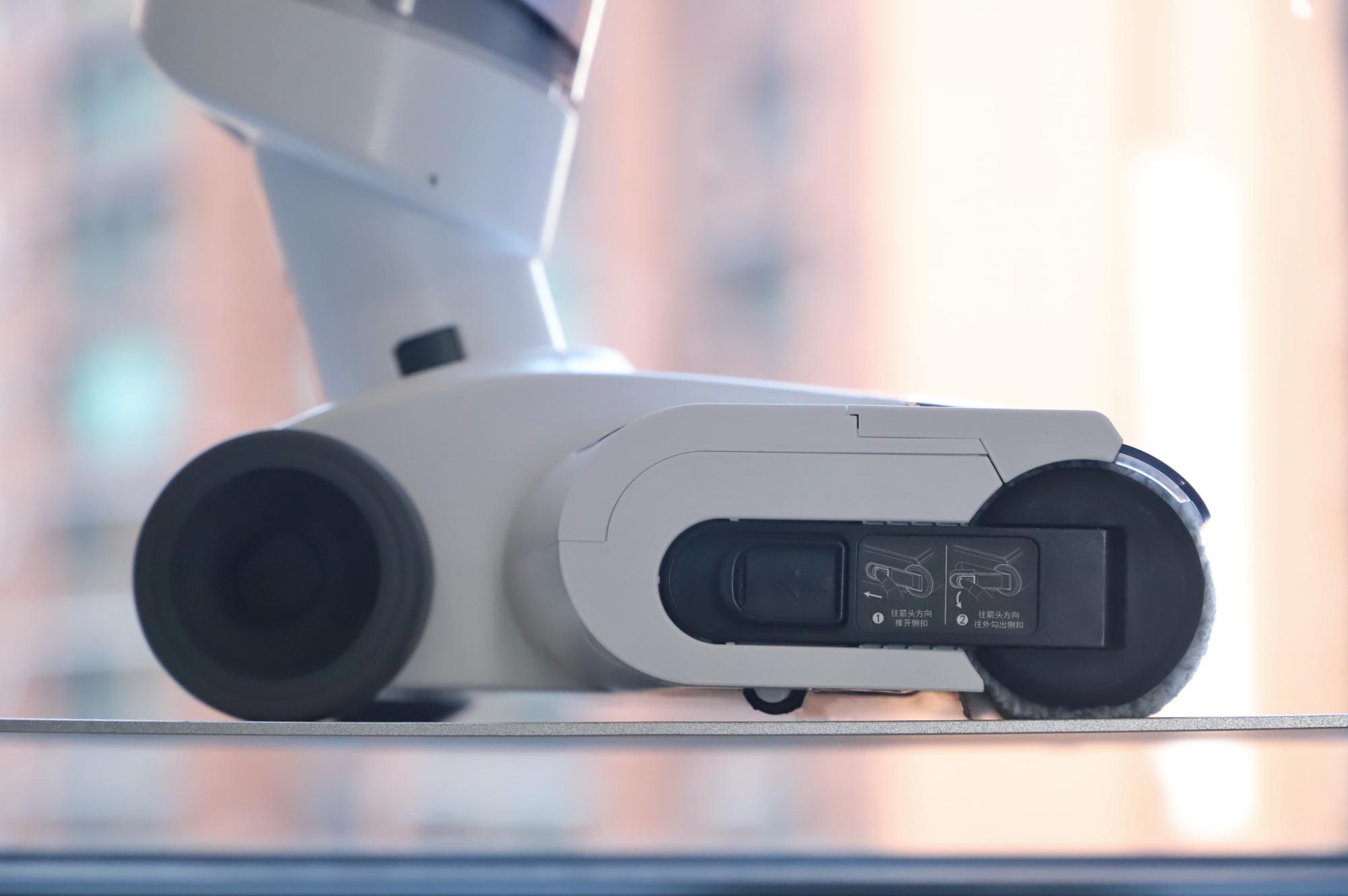 洗地机把手采用了符合人体工学的设计,握执感不错,把手前端依次为自清洁/显尘灯键、模式切换键和开/关键,方便操控。