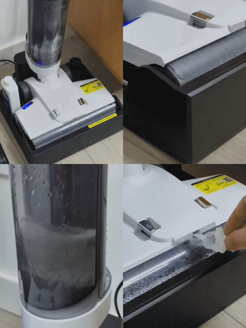 自清洁方面,西屋洗地机H40 Pro同样表现出色。它先用电解水高温60度热水去浸泡滚刷,再360度正反双向清洗,确保滚刷内的污垢得到彻底清洁。然后是管道清洗。最后,它还提供了19分钟快烘和40分钟静音烘干模式,全链路热风烘干能让滚刷、管道全部清洁烘干,自清洁后能有效去除细菌和油污,防止发霉发臭,为家居健康保驾护航。