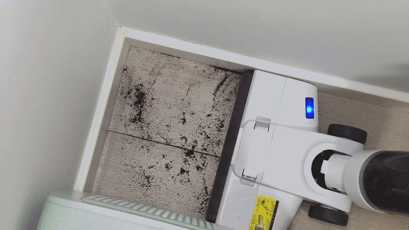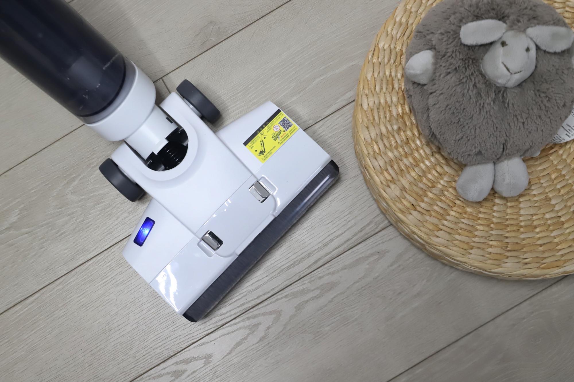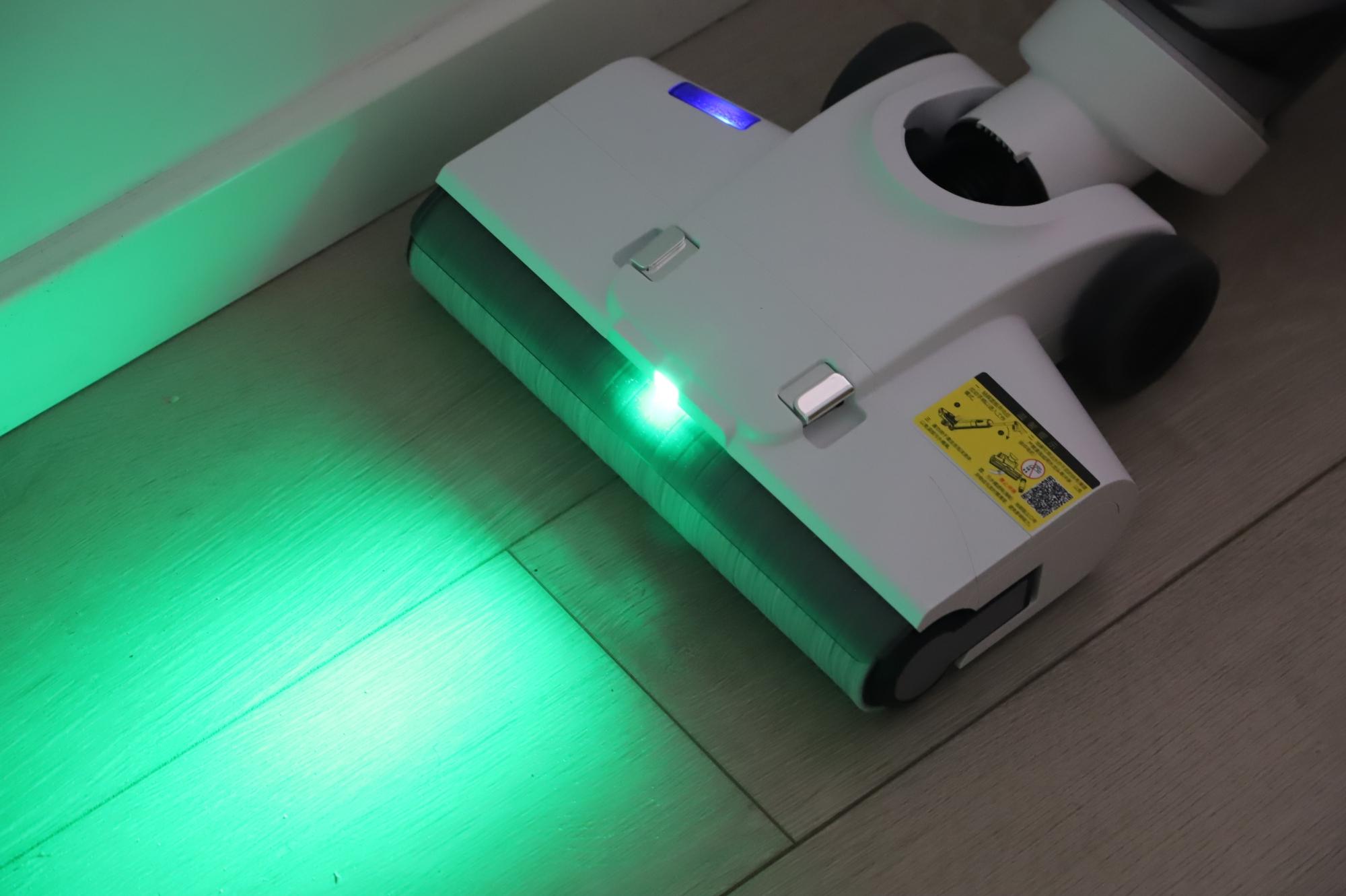 西屋洗地机H40 Pro的一大亮点是其绿光显尘功能。当洗地机开启时,洗地机滚刷机头前方会投射出一道绿光,让那些平时难以察觉的灰尘和污渍光面均匀投射。无论是地面、柜底、角落还是边缘位置的微尘都无所遁形。这一设计不仅提高了清洁的彻底性,还让用户在清洁过程中更加得心应手。尤其值得一提的是,别看这绿光让灰尘污渍一一现行,却对猫狗等宠物的眼睛没有伤害,同时清理柜底、低矮角落时显尘效果更好,木地板显灰,瓷砖则能更清晰地显示出猫毛狗毛,让家庭清洁更加细致入微。