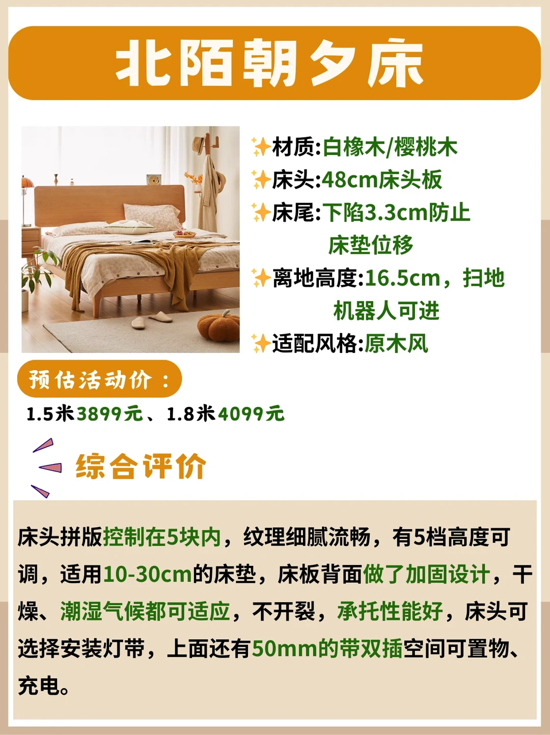 床头拼版控制在5块内,纹理细腻流畅,有5档高度可调,适用10-30cm的床垫,床板背面做了加固设计,干燥、潮湿气候都可适应,不开裂,承托性能好,床头可选择安装灯带,上面还有50mm的带双插空间可置物、充电。