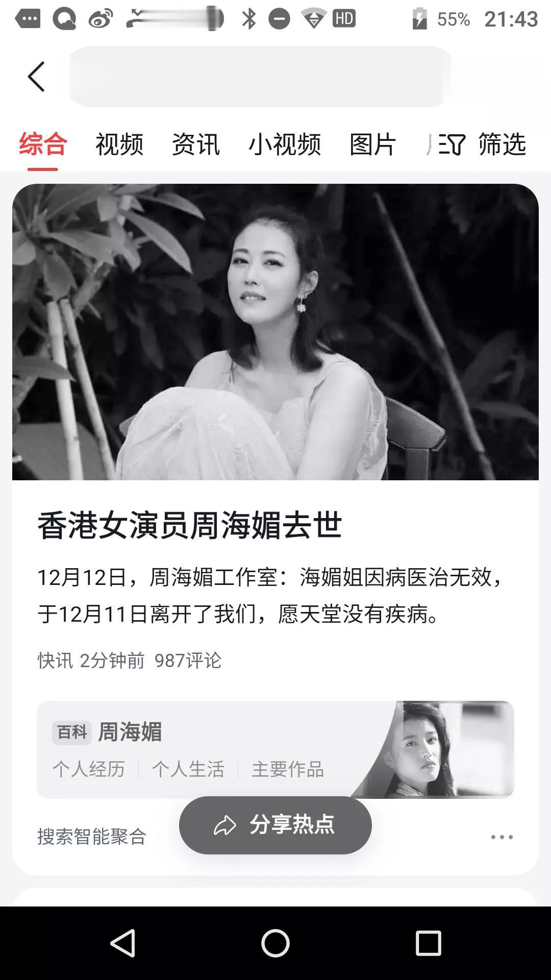 来回顾周海媚生平。 12日,工作室发文表示周海媚于2023年12月11日去世,享年57岁。↓ 1、周海媚,1966年12月6日出生于中国香港,毕业于香港顺德联谊总会谭伯羽中学; 2、1985年,周海媚参选香港小姐落选,同年参加无线第一期艺员训练班出道,并参演个人首部电视剧《杨家将》; 3、1985年,周海媚与吕良伟因合演《小岛风云》认相识,并公开承认恋情,两人后于1989年结婚; 4、1994年,周海媚参演电视剧《倚天屠龙记》,饰演周芷若一角; 5、1998年,周海媚与黄日华合作主演电视剧《天地豪情》,同年,周海媚离开TVB,转签亚洲电视台,参演王晶电视剧《纵横四海》,在剧中饰演路云; 6、1998年迪生集团执行董事伍士荣向海媚展开追求,1999年,周海媚坦承与伍士荣已分手; 7、2000年周海媚复出,拍摄亚洲电视台电视剧《影城大亨》。之后,因受身体的影响事业进入平淡期; 8、2007年,周海媚参演胡歌版《射雕英雄传》饰演包惜弱; 9、2008年,周海媚重返TVB,与刘松仁合作《蔡锷与小凤仙》,在剧中饰演小凤仙; 10、2014年12月,周海媚主演古装电视剧《武媚娘传奇》,在剧中饰演杨妃; 11、2018年1月,周海媚出演古装武侠剧《倚天屠龙记》,在剧中饰演周芷若的师父灭绝师太; 12、2023年6月29日,周海媚参加《“湾区升明月”2023大湾区电影音乐晚会》; 13、2023年12月11日,周海媚因病去世。#网传周海媚去世#