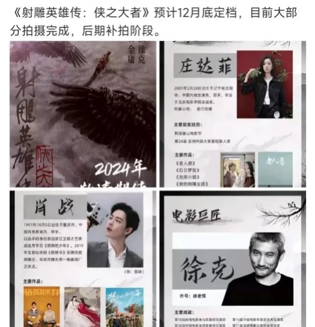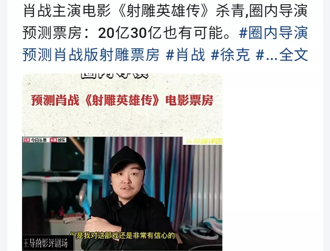 20亿、30亿都有可能,这么有把握吗?万一低估了呢,还有可能到50亿呢! 由徐克导演、当红明星肖战主演的发大型武侠电影《射雕英雄传》将被翻拍,已经杀青。 圈内导演预测,票房将达到20-30亿。看起来徐克导演一副胜券在握的样子!让我想起了一句话:徐克出品,必属精品! 相信大家一定很期待这部电影!