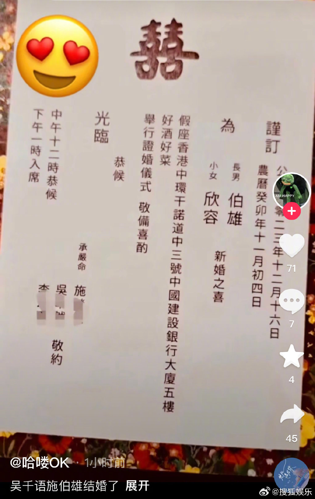 恭喜伯雄千语bb,有情人终成眷属。#吴千语最后会跟施伯雄结婚吗##吴千语结婚#