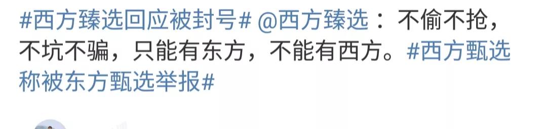 西方甄选无奈回应被封号!#西方甄选被封号# 人家是东方不败,你是西方必败。 自古东西对立,只能有一方存活!