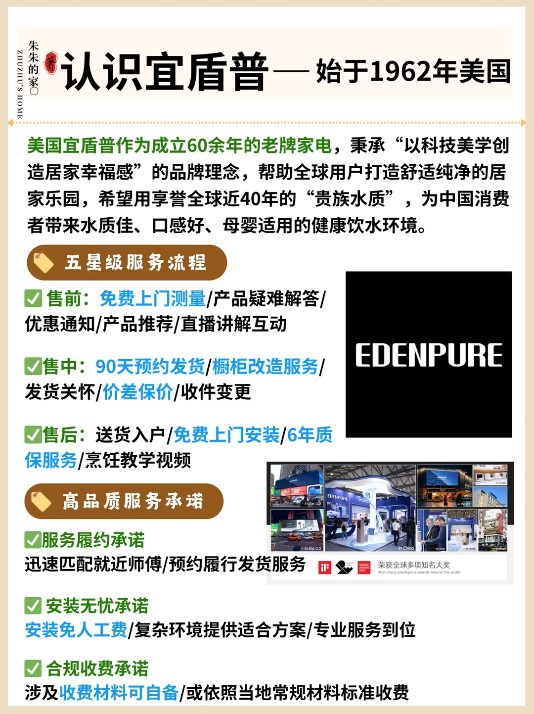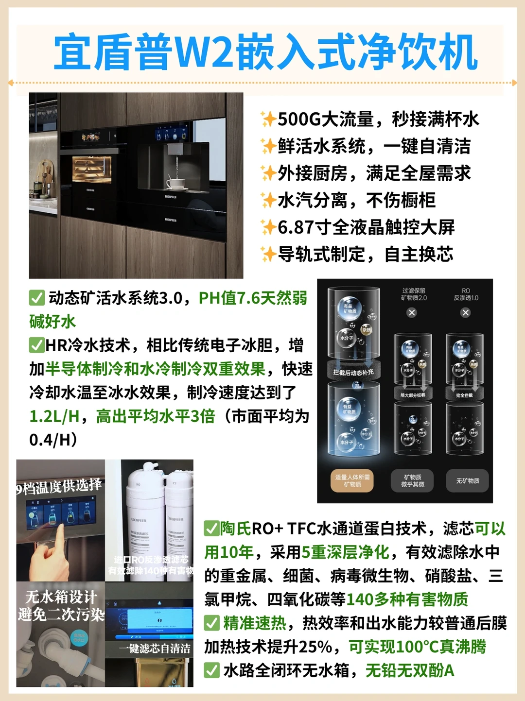 宜盾普W2嵌入式净饮机。作为美国专研电器60年的老品牌,在净水技术方面领先。动态矿活水系统3.0,PH值7.6天然弱碱好水。精准速热,热效率和出水能力较普通后膜加热技术提升25%,日常寿命可达15年以上。HR冷水技术,相比传统电子冰胆,增加半导体制冷和水冷制冷双重效果,快速冷却水温至冰水效果,制冷速度达到了1.2L/H,高出平均水平3倍(市面平均为0.4/H)。陶氏RO+ TFC水通道蛋白技术,滤芯可以用10年,采用5重深层净化,有效滤除水中的重金属、细菌、病毒微生物、硝酸盐、三氯甲烷、四氧化碳等140多种有害物质。水路全闭环无水箱,无铅无双酚A,家有老人小孩使用更放心。