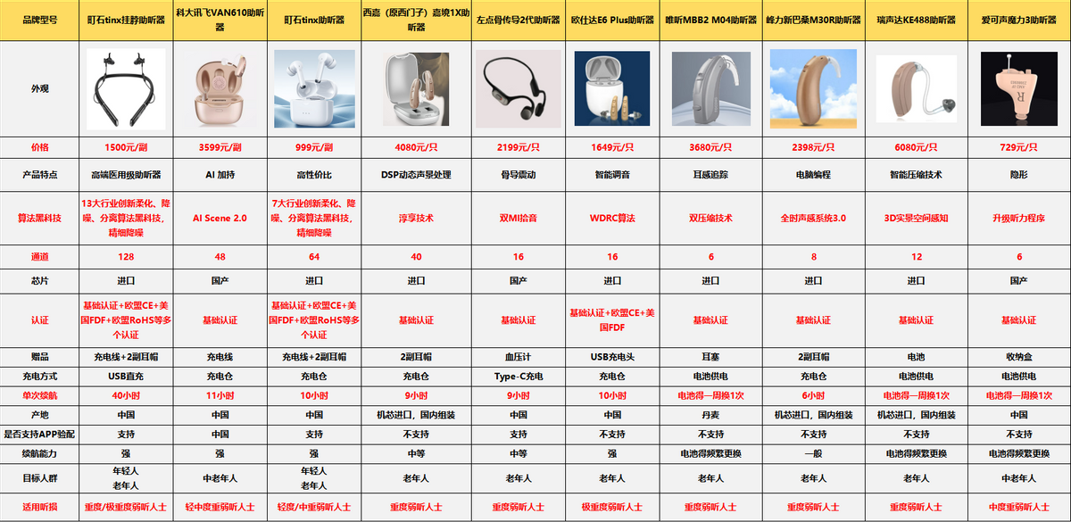 不确定从哪一款开始看?那不妨先从参数入手,很多东西一对比就有感觉了。这几款参与测评的助听器我都简单整理了一下,下面是它们的基础配置情况。