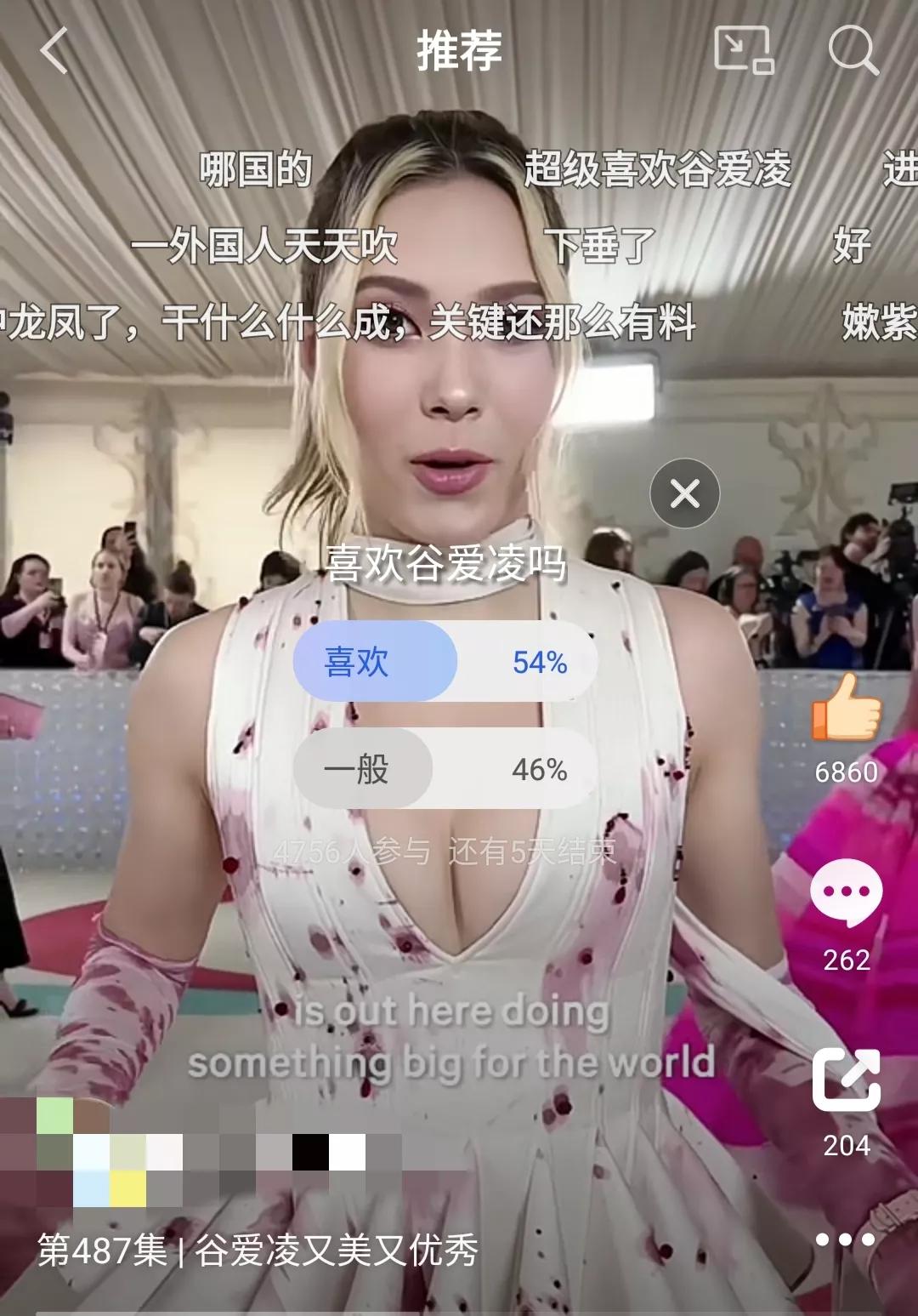 从投票结果看,有一半人不喜欢谷爱凌。 谷爱凌参加活动,操着一口流利的英语。 穿着深V装,两撮黄色的波浪型毛发从脸颊两侧垂下,身后的摄像机和目光都对准了她,人气可见一斑!