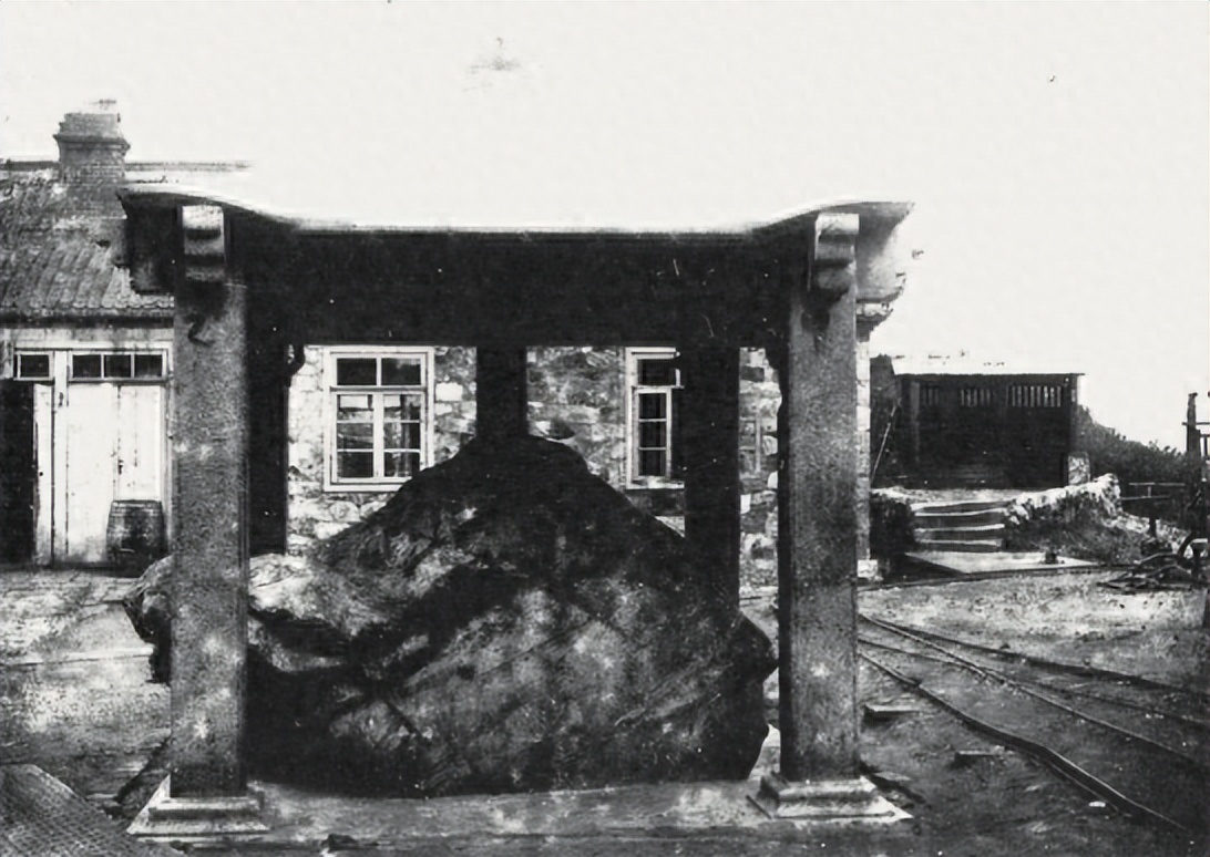 影像铁证:掠夺发生后,石碑被安置在日本皇宫内收藏“战利品”的建安府旁。照片显示,保护碑的石亭立柱上留下了明显的切割断痕,无声控诉着暴力拆卸的过往。