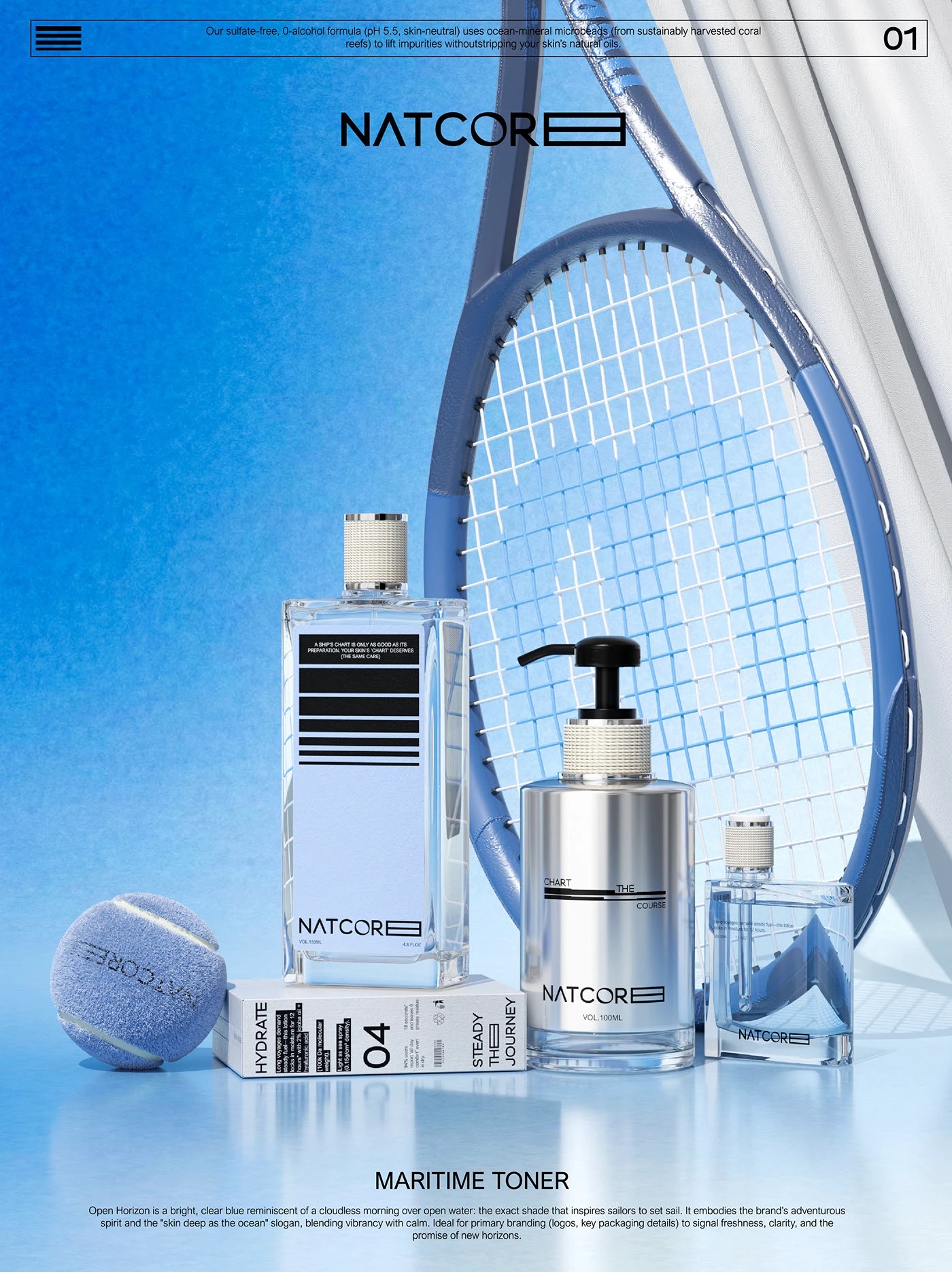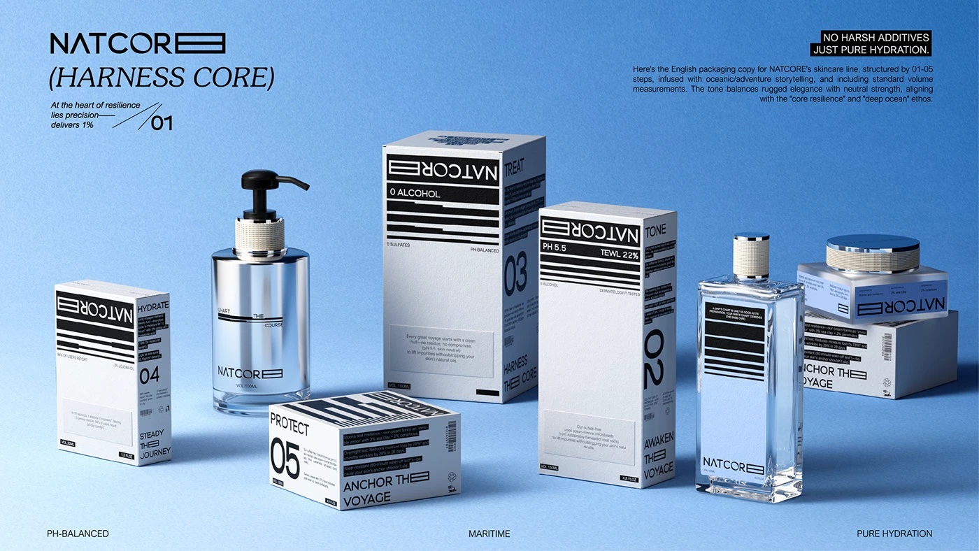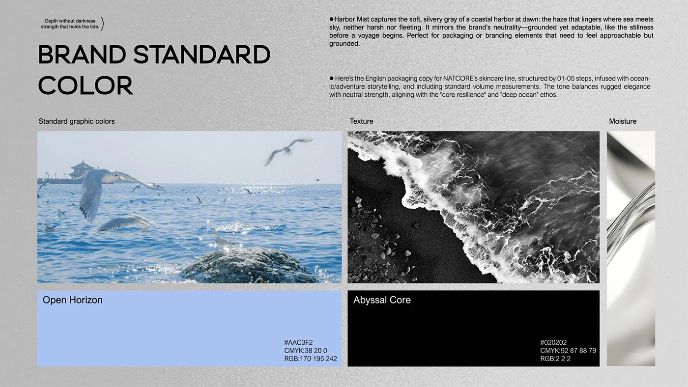 NATCORE 护肤套装包装以 “深海” 与 “冒险” 为核心设计灵感,构建专属核心色彩体系 —— 港湾雾银灰复刻黎明海岸的柔润质感,呼应品牌沉稳适配的中性特质;无垠晴空蓝再现无云海面的澄澈明亮,彰显探索精神与 “肌如深海” 的品牌主张。包装文案秉持 “无刺激・纯保湿” 理念,以粗犷优雅与中性力量兼具的调性,紧扣 “坚韧” 内核传递 “深度不暗沉,力量御潮汐” 的品牌态度。设计适配 logo、关键包装细节等核心场景,既通过海洋叙事营造清新澄澈的探索意境,又以精准的视觉与文字表达,强化品牌辨识度与质感,契合多场景传播需求。