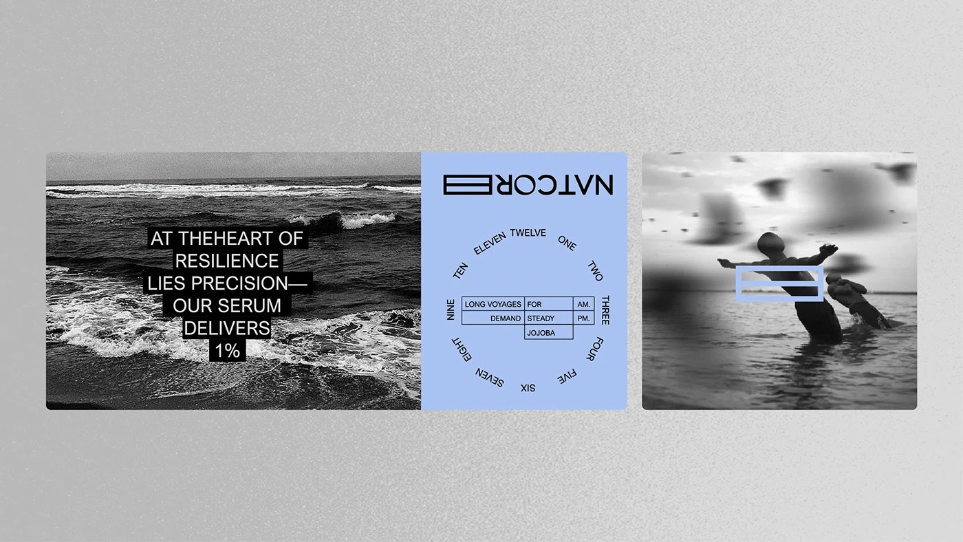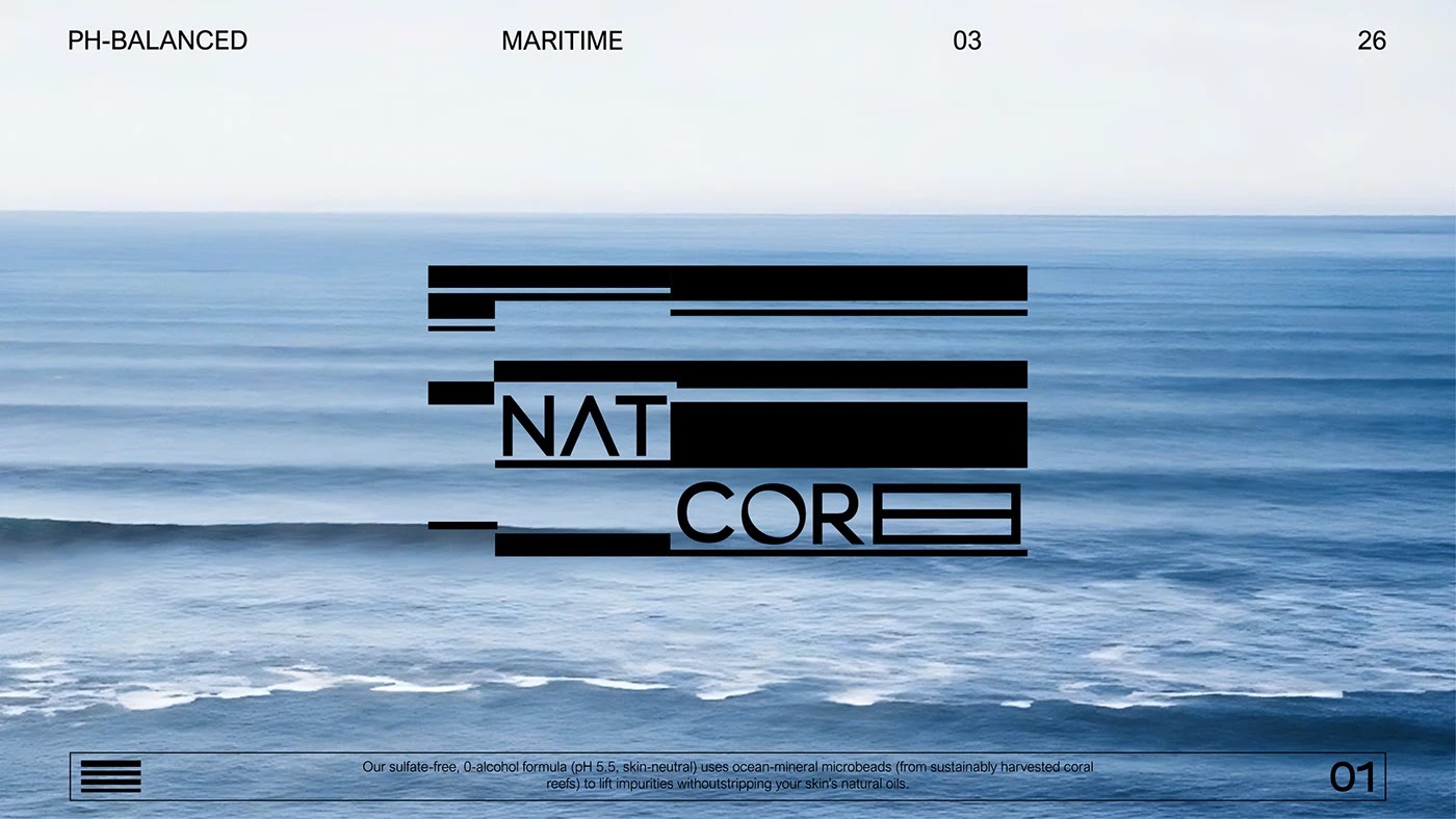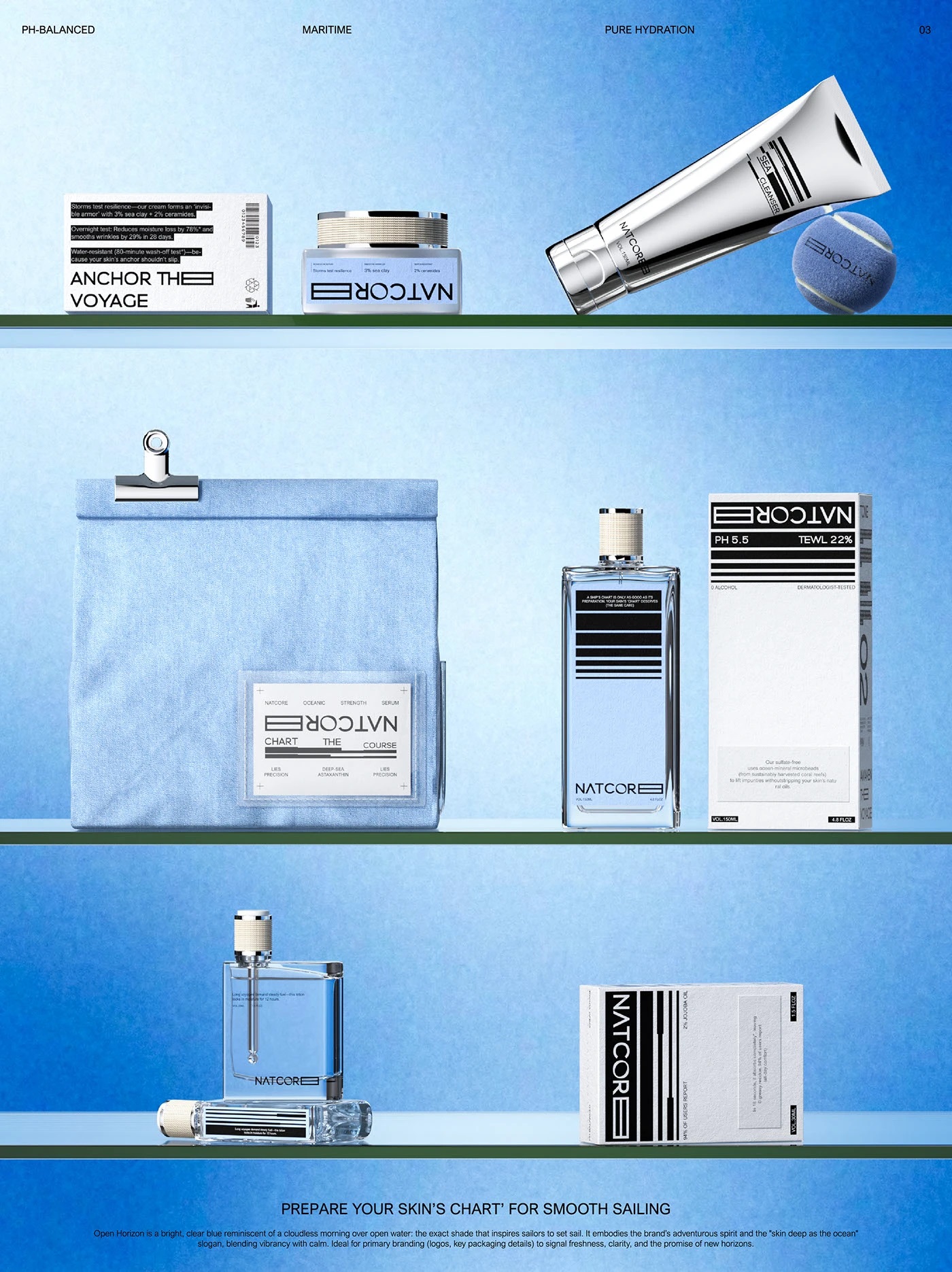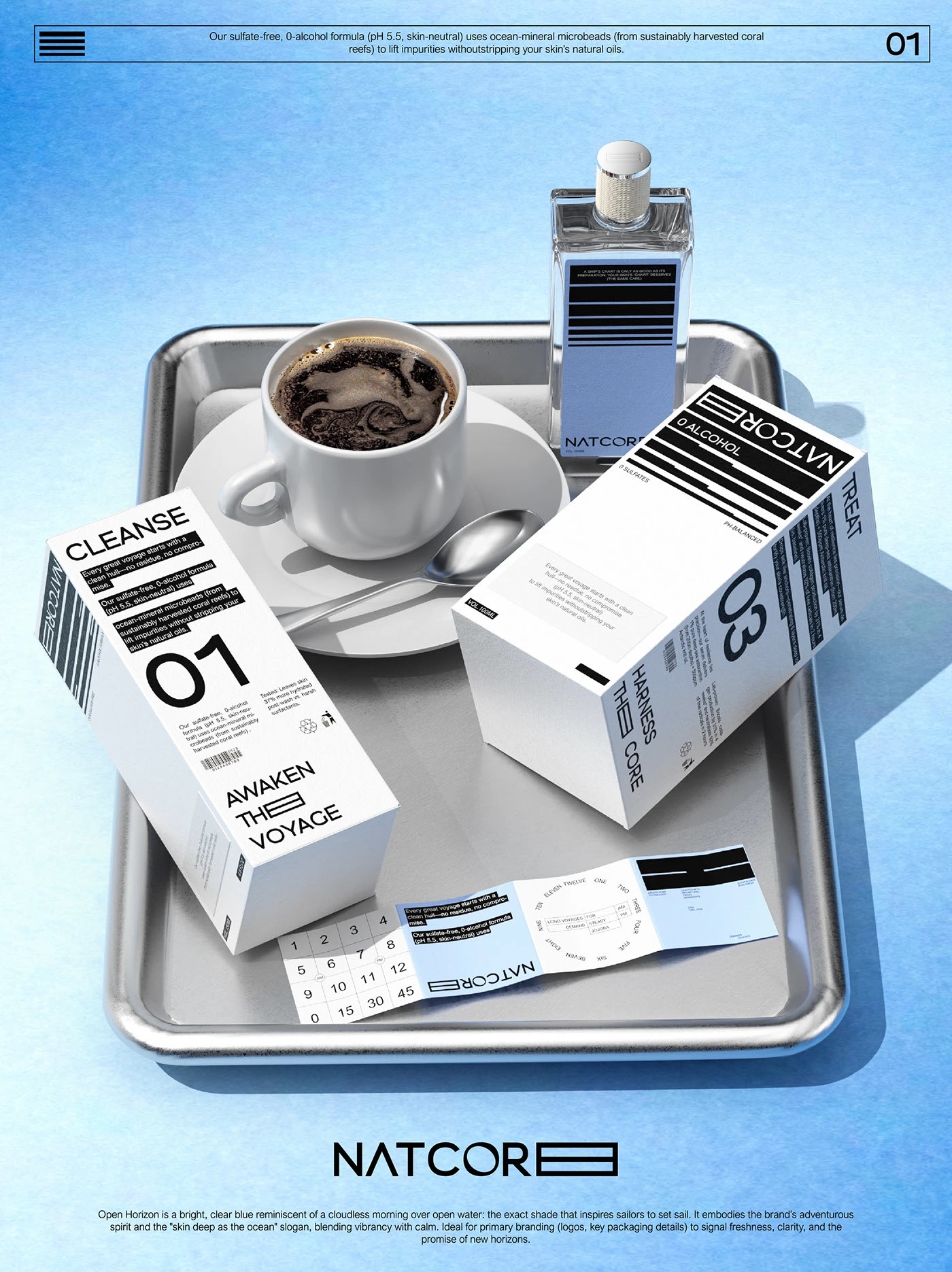 NATCORE 护肤套装包装以 “深海” 与 “冒险” 为核心设计灵感,构建专属核心色彩体系 —— 港湾雾银灰复刻黎明海岸的柔润质感,呼应品牌沉稳适配的中性特质;无垠晴空蓝再现无云海面的澄澈明亮,彰显探索精神与 “肌如深海” 的品牌主张。包装文案秉持 “无刺激・纯保湿” 理念,以粗犷优雅与中性力量兼具的调性,紧扣 “坚韧” 内核传递 “深度不暗沉,力量御潮汐” 的品牌态度。设计适配 logo、关键包装细节等核心场景,既通过海洋叙事营造清新澄澈的探索意境,又以精准的视觉与文字表达,强化品牌辨识度与质感,契合多场景传播需求。