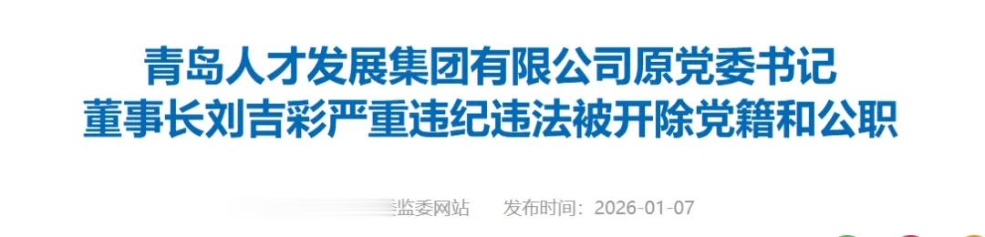 日前,经青岛市委批准,青岛市纪委监委对青岛人才发展集团有限公司原党委书记、董事长刘吉彩严重违纪违法问题进行了立案审查调查。