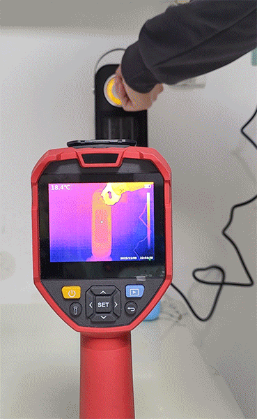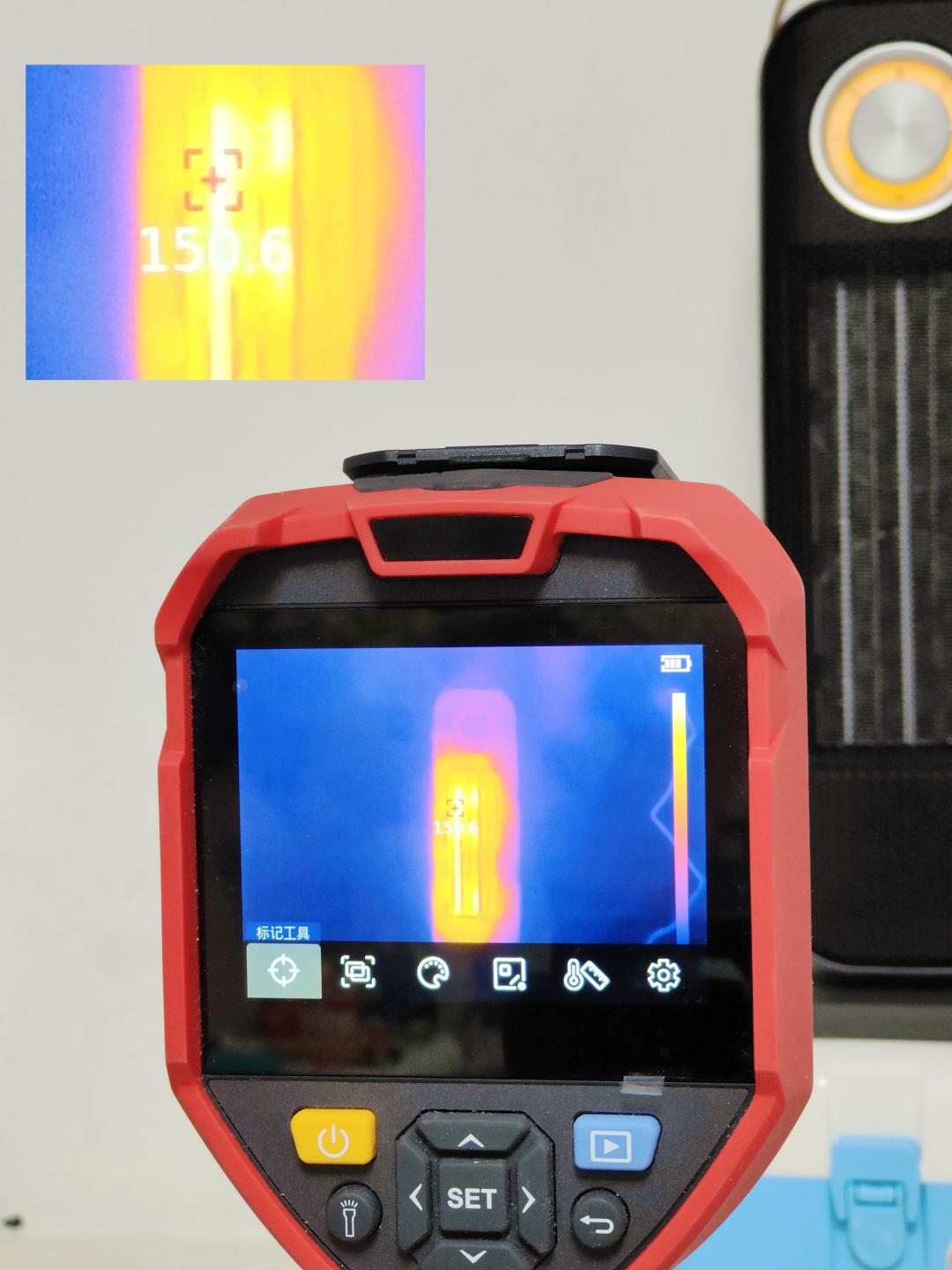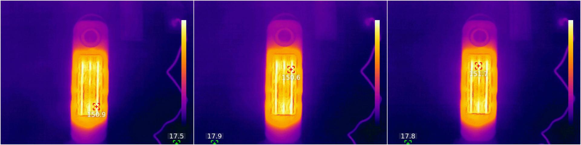 为了更加直观地展示西圣Warm X立式暖风机的升温效果,我使用了专业的红外测温设备进行了测试。通过画面可以看到从室温18℃升至最高温度只需要十几秒的时间,实测这款暖风机的最高温度能达到150℃左右,对于家用场景完全够用了。