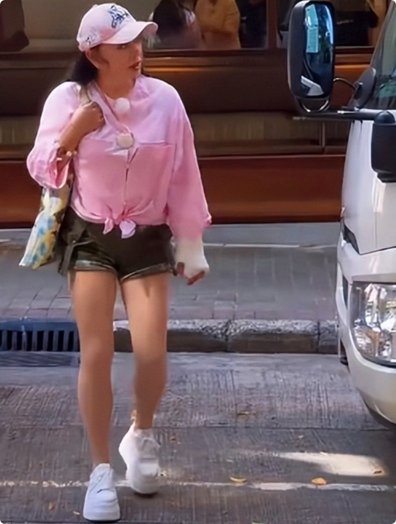 在香港路透中,刘晓庆穿着粉色衬衫搭短裤,配肉色丝袜,高调又自信。