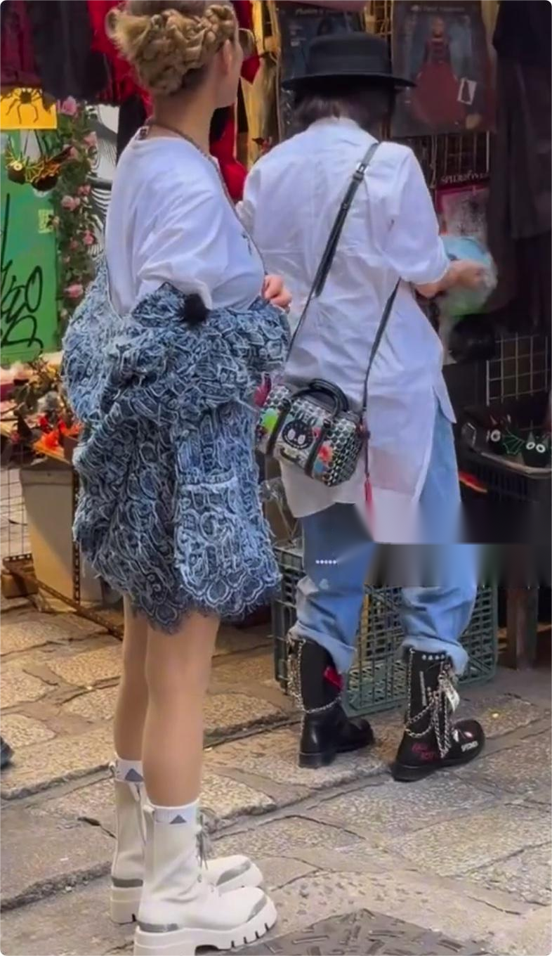她身穿牛仔短裙套装、扎着两个丸子头,配高筒靴,看上去青春又叛逆。