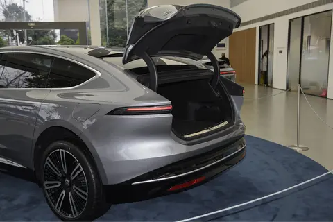 车身侧面采用极具动感的轿跑式溜背设计,线条比较利落干练,有点跨界的味道。无框车门与平行抽屉式隐藏门把手的组合,不仅让侧面更显优雅流畅,还减少了商务接待时的磕碰隐患,高速行驶时也能降低风阻。尾部造型紧凑动感,虽然后挡风玻璃的面积较小,但配备了后视摄像头,视野完全不受影响。尾箱盖上的电动扰流板有点像飞机尾椎,可根据车速自动升降,增强高速行驶的稳定性。贯穿式尾灯是当下流行的元素,点亮后辨识度很高。下包围配备有粗壮的黑色饰板,同时加入贯穿式镀铬条进行装饰,凸显了力量感。车身提供深空黑、云白、南极星蓝、月辉银、曙光金等颜色,其中子夜镜瓷蓝算是官方的招牌色了,在不同光线下呈现出细腻的色彩变化,比普通车漆更有高级感。