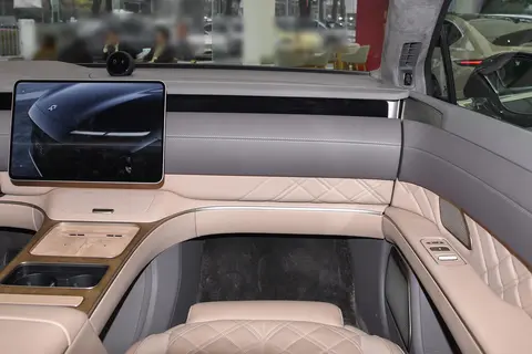 中间的行政桥设计特别贴心,商务会谈时传递文件、递送名片都不用起身,直接放在中间的通道上就能完成,让商务交流更高效自然。而且,它上面还集成了可360度无极调节的行政桌板,展开后能平稳放置笔记本电脑和文件,方便随时处理公务;内嵌的电动冰箱支持-2℃到55℃的温度调节,无论是冰镇香槟还是加热咖啡,都能轻松满足。更贴心的是,车辆解锁时会自动降低车身高度,配合电动开合的无框车门与较大的开启角度,即便穿着正装也能优雅上下车,不会出现传统豪车钻进钻出的尴尬场面。