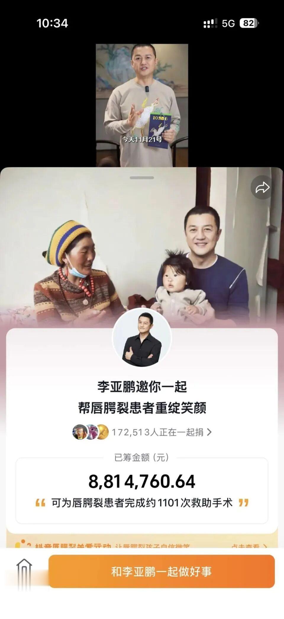 不少网友拥入李亚鹏抖音平台2025年11月21日发布的消息下,寻找“嫣然唇腭裂患者救助计划”捐款入口。上午9:27,记者发现捐款页面“已筹金额”显示收到850万爱心款,10:33,爱心款已经增长到881万。