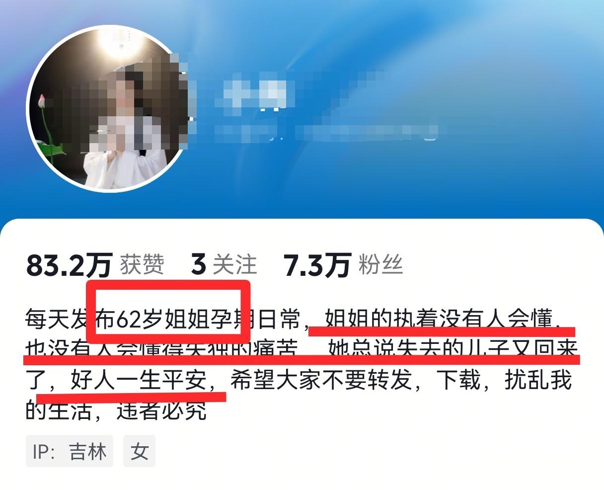 原来,这位62岁的女子是因为丧子之痛,据其账号主页介绍,她2025年正月失去独子,此次怀孕是做的试管婴儿。