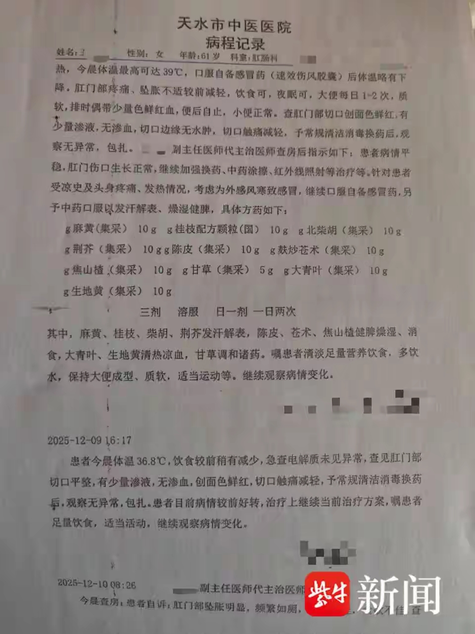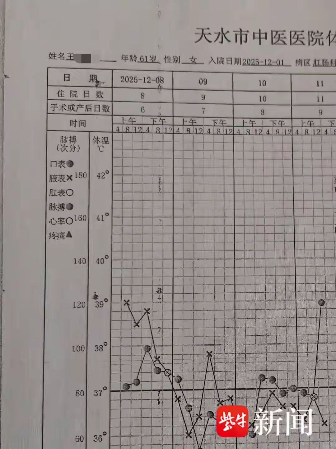 据家属石先生讲述,他的母亲王女士今年61岁,因长期受痔疮困扰,于2025年12月1日入住天水市中医医院肛肠科。之所以选择这家医院,是因为20年前王女士曾在此成功进行过同类手术,家人觉得“比较放心”,且离家近方便照顾。12月2日,王女士接受了痔疮手术,术后一直在院观察。