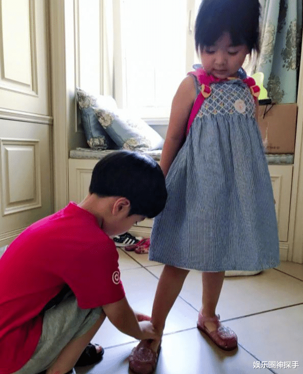 再长大一些,他已经知道给小女孩穿鞋子,是个很贴心的小暖男一枚。