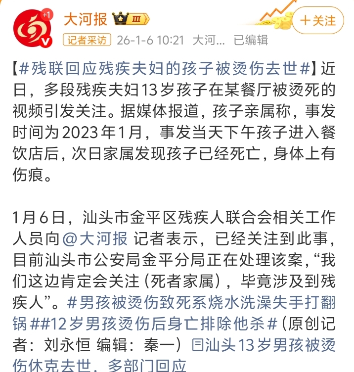关于网传我街道餐饮店一男孩被烫伤致死一事,现将情况通报如下: