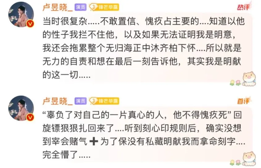 最新的姻缘石刻字原是高潮剧情,但观众依旧觉得寡然无味,纪伯宰在前面生不如死的接受雷罚,明意只在后面默默看着,这个剧情遭到网友的质疑,还逼得女主卢昱晓下场解释,明明是编剧的锅却扣在了演员头上。