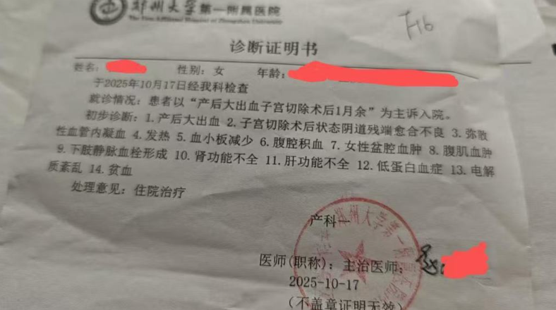 巨大的打击让乔乔悲痛欲绝,她开始明确拒绝黑代孕机构负责人再来探视。郑州大学第一附属医院 2025 年 10 月 17 日出具的诊断证明显示,乔乔的病症多达 14 项,包括产后大出血、子宫切除术后状态伴阴道残端愈合不良、弥散性血管内凝血、血小板减少、腹腔积血、下肢静脉血栓形成等多种并发症。更让人心寒的是,这份诊断证明的姓名一栏,填写的依旧是 “石某某”。