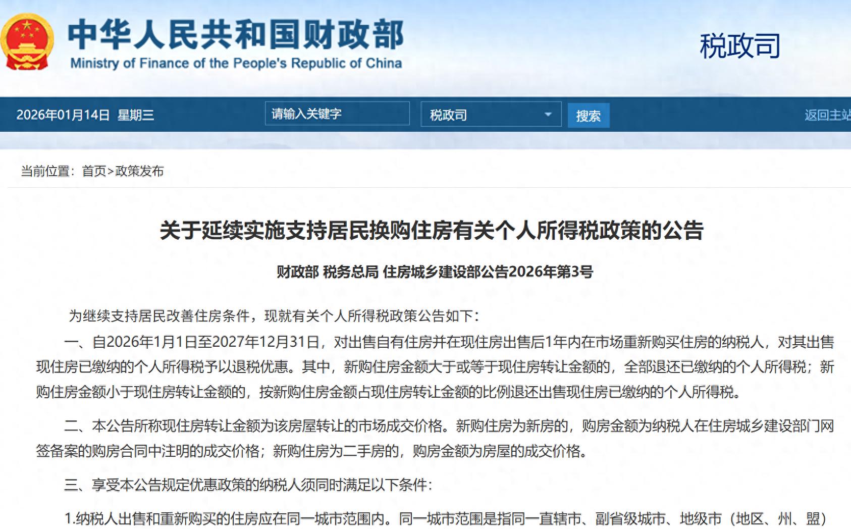 公告显示,自2026年1月1日至2027年12月31日,对出售自有住房并在现住房出售后1年内在市场重新购买住房的纳税人,对其出售现住房已缴纳的个人所得税予以退税优惠。