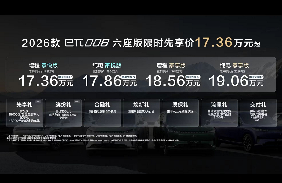 8月份的第一天,东风奕派科技在江城武汉迎来了三大品牌资源整合后的首次集中亮相。会上,2026款东风奕派eπ008六座版焕新上市,官方指导价18.86万-20.36万元,限时先享价17.36万元起,另外还有多重购车权益,诚意满满。