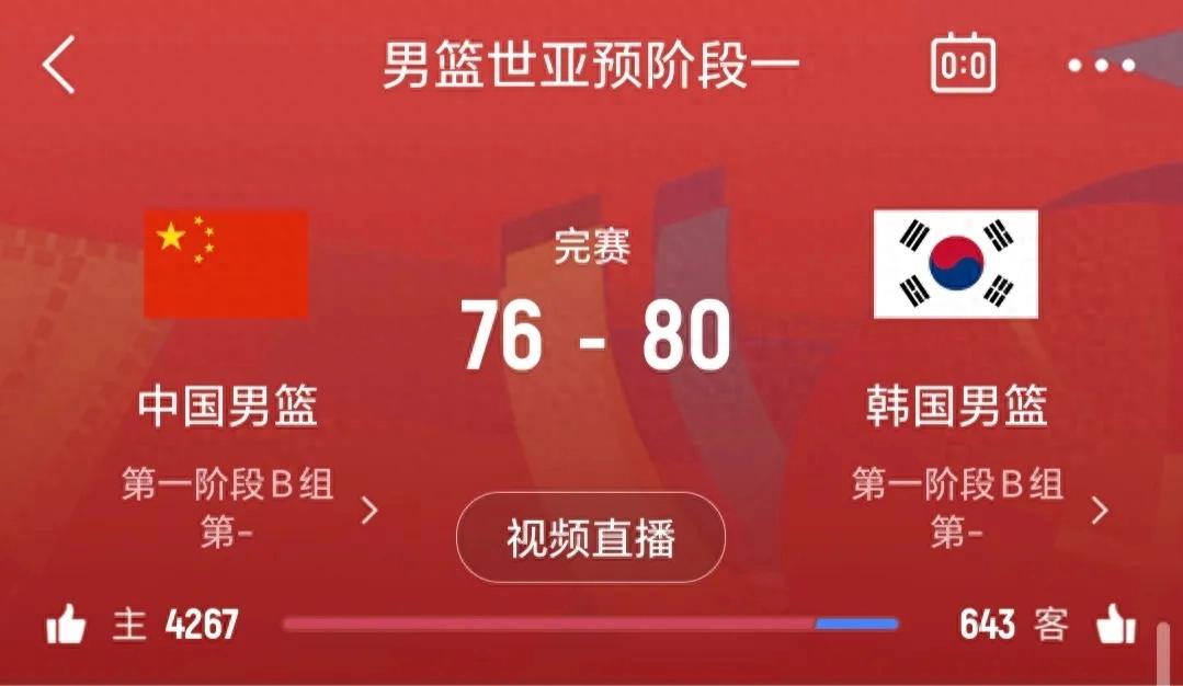 中国队在主场迎来世预赛首个对手,最终中国队76-80输给韩国队没能取得开门红。数据方面,周琦11分12板、高诗岩6分6板、胡明轩2分2助、朱俊龙2分2断、曾凡博2分、 张镇麟20分2板、廖三宁17分2助、胡金秋10分2板、程帅澎6分2助。