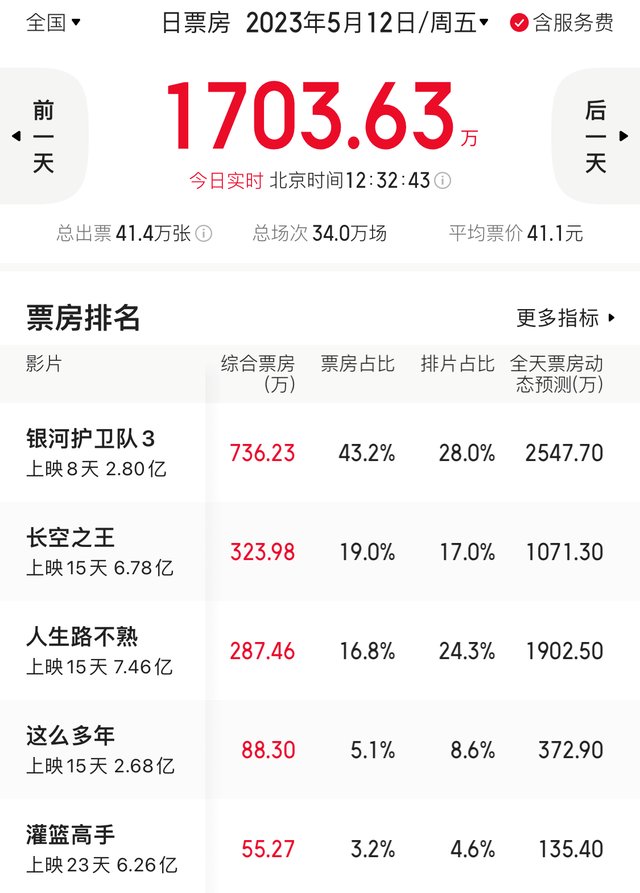 截止5月12日周五中午12点,在有4部新片上映的情况下,拿下日票房冠军的依旧是漫威的超级英雄电影《银河护卫队3》,目前该片已经连拿了8天的票房冠军,上映8天总票房2.8亿。