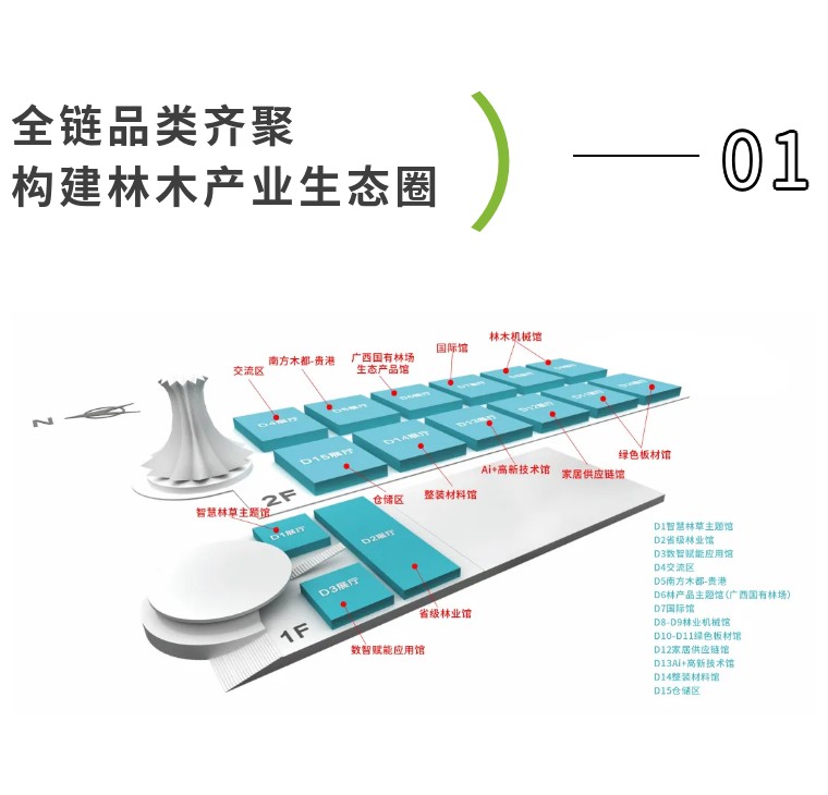 作为全球林木行业高新技术首发平台,本届展会以“数智赋能林木业高质量发展”为主题,展览面积60000平方米,预计吸引观众120000人次,参展商1000+家。展会启用南宁国际会展中心14大展馆,D1智慧林草主题馆,D2省级林业馆,D3数智赋能应用馆,D4交流区(包含论坛区、设计东盟·2025广西设计展),D5南方木都-贵港(贵港特色木业展示区),D6林产品主题馆,D7国际馆,D8-D9林木机械馆,D10-D11绿色板材馆,D12家居供应链馆,D13Ai+高新技术馆,D14整装材料馆。展出范围覆盖人造板、整家定制、整装材料、木工设备、木化工辅料及配套件、原材料供应链、林业综合等七大类别,集中展示林产品及木制品全产业链的企业和产品。其中,索菲亚家居、万华生态板业、弘亚数控机械、深圳大疆、极东机械、普瑞特机械、三威新材、一家美人造板、丰林集团、元丰新材、鲁桂木业、壮象木业、宝尔康新材、大王椰板材、多得乐新材、森工集团、兔宝宝定制、新港集团、平安树板材、小摇篮板材、爱阁工房、润泓木业、怡黄木业、祥盛集团、德科新材、桂福林木业、明源木业、瀚秋智能装备等优秀企业将携新品优品共赴这场木业供应链盛会。