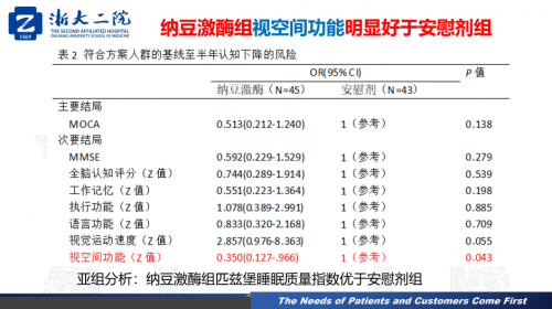 经过三年的临床研究,今年在第十三届“西湖论健”论坛上,课题组成员浙江大学医学院附属第二医院神经内科张旭婷主任医师发表了主题演讲。她介绍说,该项研究采用科学严谨且证据级别很高的RCT研究方法(双盲、随机、安慰剂对照),受试者每日口服NSKSD纳豆激酶胶囊2粒(日生研生命科学(浙江)有限公司提供,纳豆激酶活性含量4000FU/粒,早晚各1粒),持续6个月后,观察认知功能评分,包括蒙特利尔认知评估量表MoCA、简易智能状态检查量表MMSE、临床痴呆评定量表CDR、睡眠评分等。研究结果显示,NSKSD纳豆激酶组视空间功能明显好于安慰剂组,且亚组分析应用产品组匹兹堡睡眠质量指数优于安慰剂组(P值0.028),表明非药物的功能营养食品NSKSD纳豆激酶对无症状性颅内/颈动脉狭窄患者认知功能的改善和睡眠质量的提高是有效的。