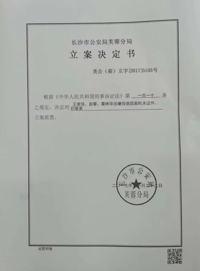 但自2017年11月22日长沙市公安局芙蓉分局对栗林华、王斐侠、赵攀三人“涉嫌伪造国家机关证件、印章”立案侦查以来,至今7年时间,刑事案件毫无进展。
