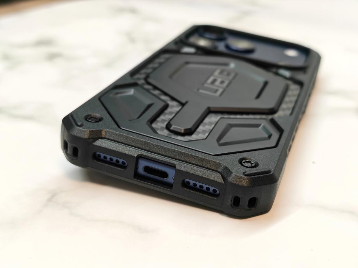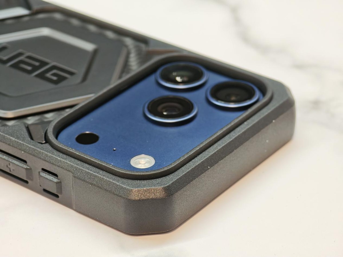 针对iPhone 17Pro硕大凸起的镜头模组,UAG碳纤维手机壳壳身镜头区域特意做了2mm加高处理,给镜头提供周到的防护。