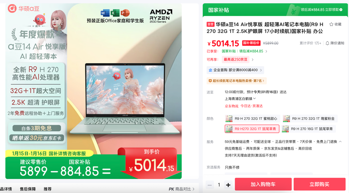 当前购机还可领取至高884.85元国家补贴,到手价5014.15元,同时可享受a豆无忧服务(2年国际整机保修、2年硬件专家上门服务、2年不限次远程协助),售后保障拉满。如果你正在寻找一台能提升效率,而且兼顾颜值与实用性的AI轻薄本,华硕a豆14 Air 悦享版绝对值得入手,上京东商城搜索#华硕a豆14 Air 悦享版#,即可了解更多详情。