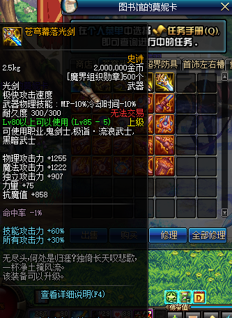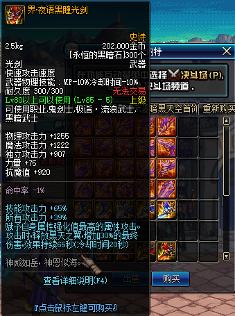 苍穹暮落光剑,攻击1255,力量+75,技能攻击力+60,所有攻击力+30,这就是魔界毕业装了,算是现有第三阶段毕业装