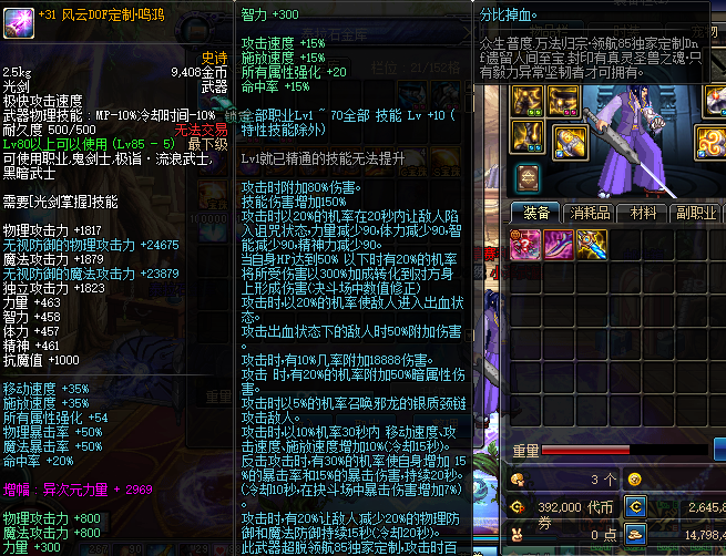 界·夜雨黑桐光剑,攻击力+1255,力量75,抗魔值+920技能攻击力+65,所有技能攻击力+39,技能攻击力+65,第四阶段毕业装,普雷