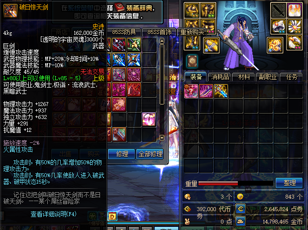 85SS武器,破日惊天剑,格兰迪发电站毕业武器,攻击1267,力量291,,50%的几率增加50的物理攻击力,有了85级武器防具和首饰就可以进行第二阶段,安图恩