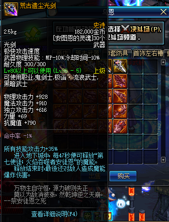 安图恩毕业装85级SS,荒古遗尘光剑,物理攻击928,力量69,所有技能攻击力+35%,这就是安图恩毕业装的武器