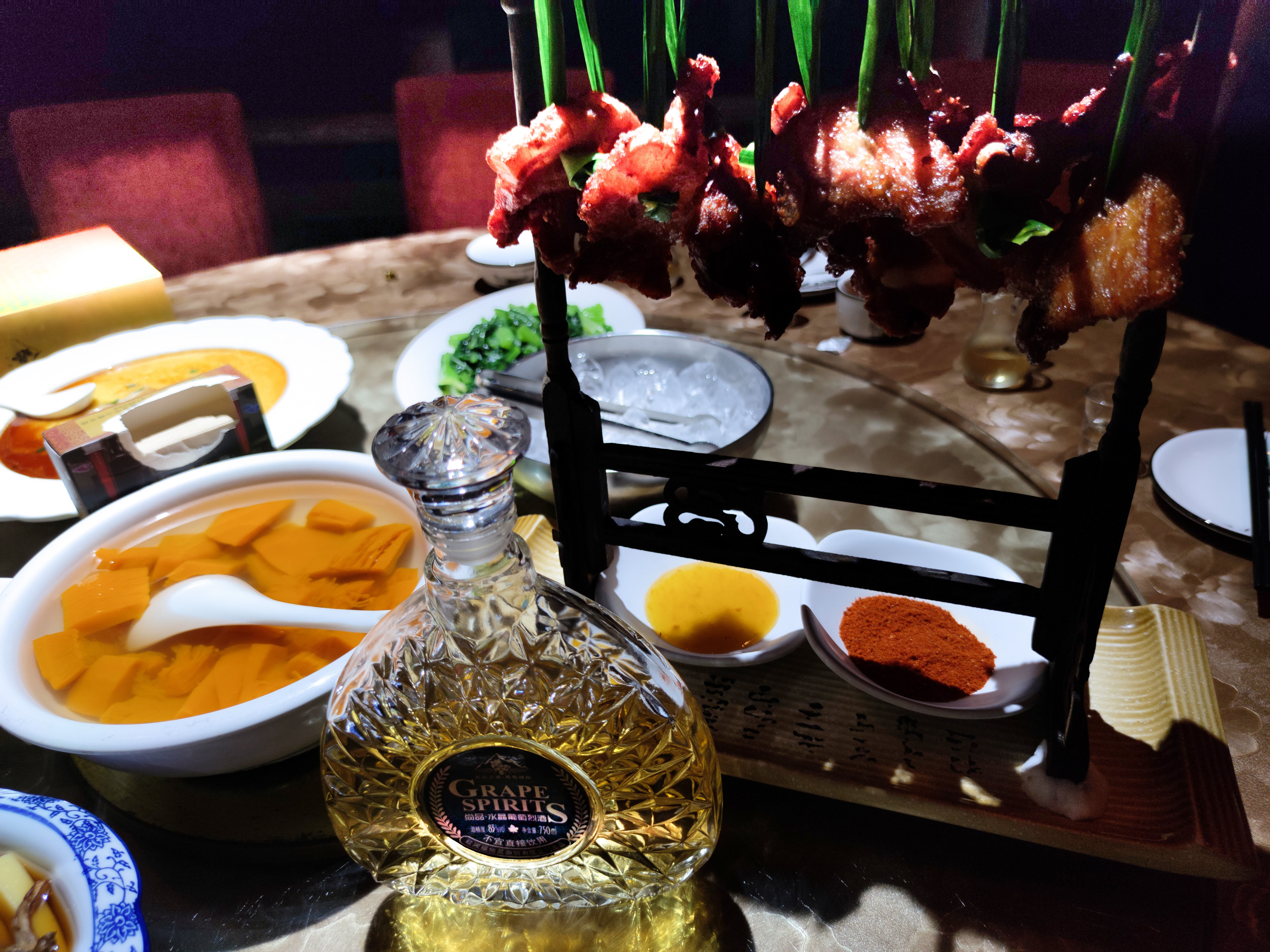 云南夜局的狠活,是83度葡萄烈酒怼满冰——琥珀酒液裹着果香撞进喉咙,烈劲儿裹着凉意直接炸场。悬架上的烤肉串着青葱段,焦皮浸满烟火气,裹酱滚辣粉的瞬间,脂香烫得嘴麻还想狂炫。甜糯南瓜汤接住酒意,这冰火对撞的爽感,谁喝谁喊“这哪是酒是续命神器啊”!
