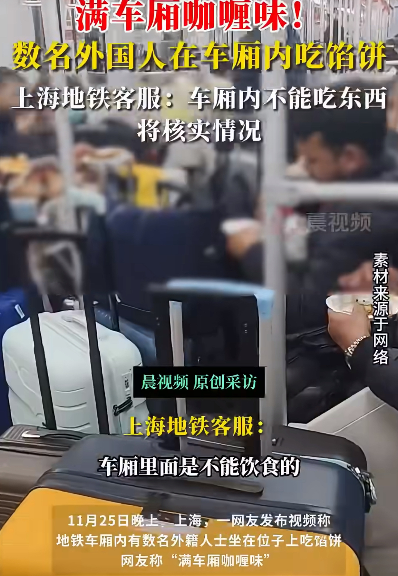 有网友在网上发布视频,画面里,地铁车厢内,数名外籍人士坐在位子上,人手一个行李箱,正旁若无人地吃着馅饼。那场面,周围弥漫着一股味道,网友还形容“满车厢咖喱味”。这视频一出来,瞬间就引发了大家的关注。虽然网友没说明具体事发时间和地点,但其他网友根据车厢玻璃后露出的半个地铁站名,推测是在上海浦东国际机场附近的“凌空路”地铁站。
