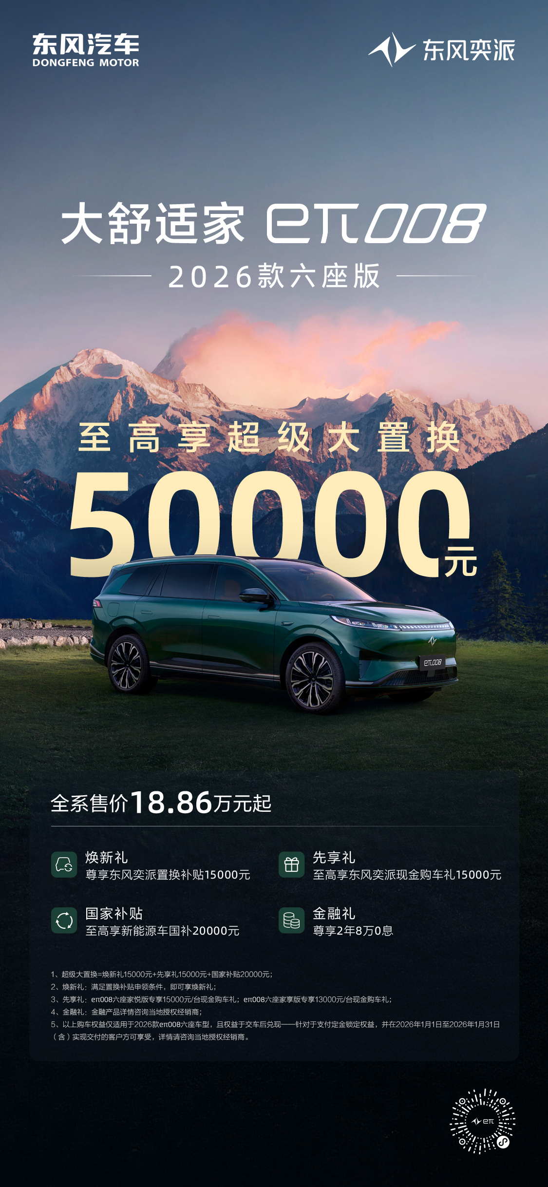 eπ008六座版目前全系售价18.86万元起,尊享50,000元的超级购车权益,包括15,000元的东风奕派品牌置换补贴、最高20,000元的国家新能源汽车补贴,以及至高15,000元的东风奕派现金购车礼,进一步降低购车成本。此外,eπ008六座版还可享受“2年8万0息”的灵活金融方案,助力用户轻松实现理想座驾升级。